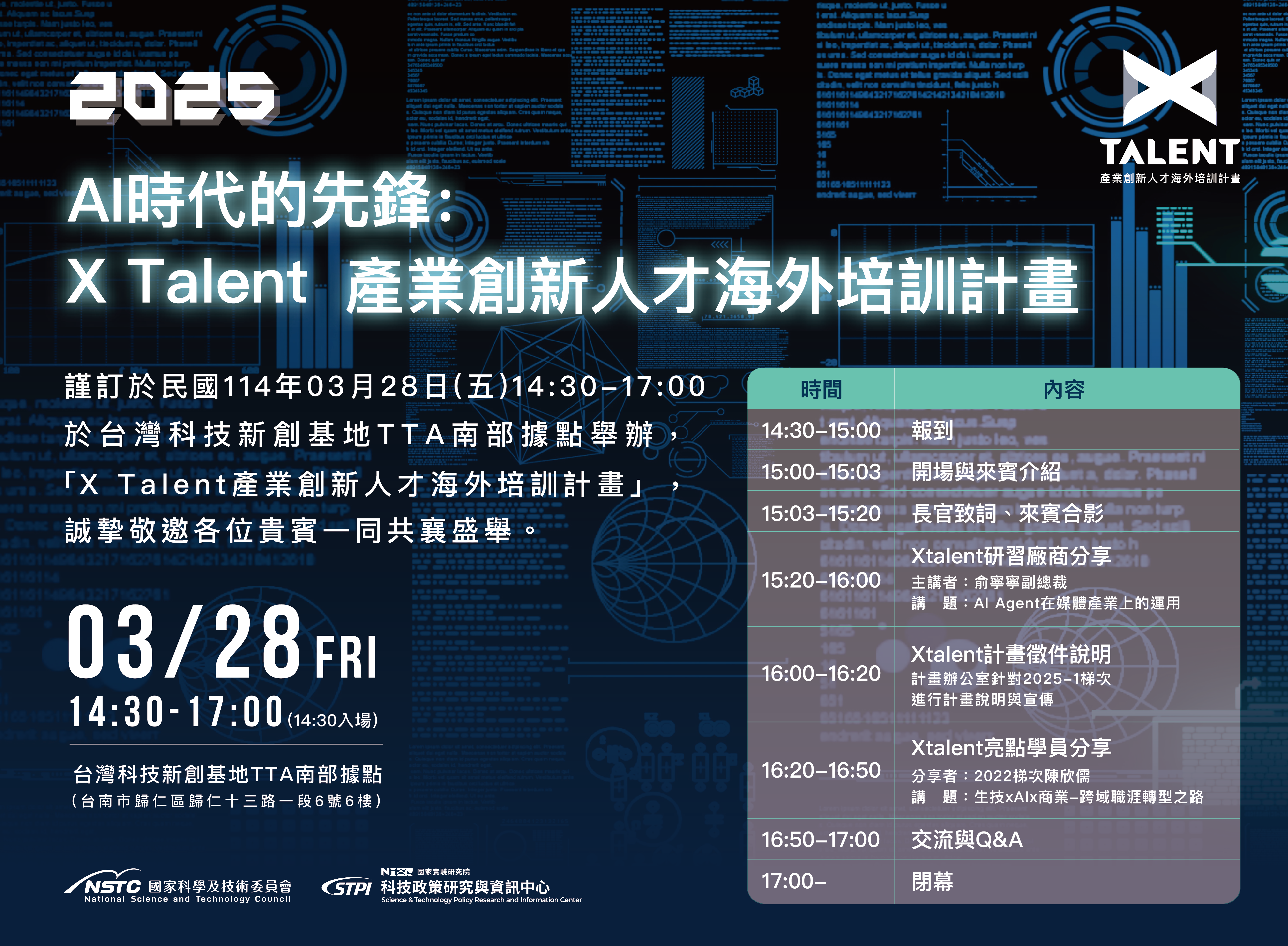 說明會將於 2025 年 3 月 28 日(五)14:30-17:00 假 台灣科技新創基地 TTA 南部據點 舉行,