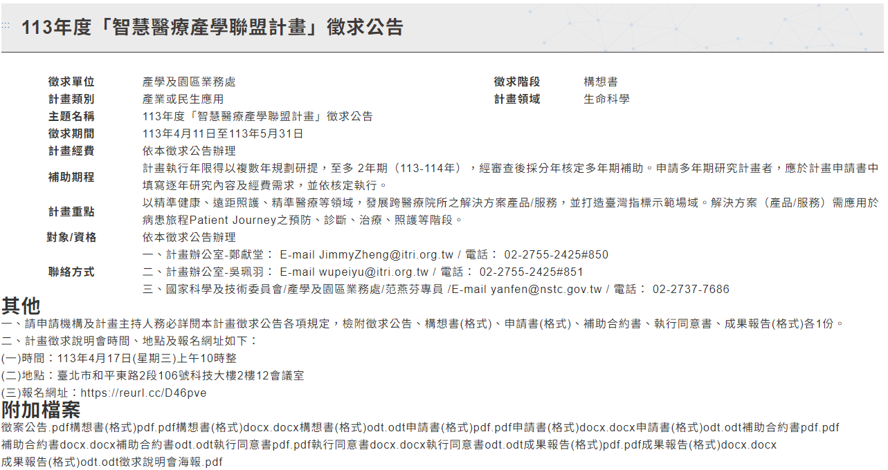 【計畫徵求公告】國科會113年度「智慧醫療產學聯盟計畫」徵求公告